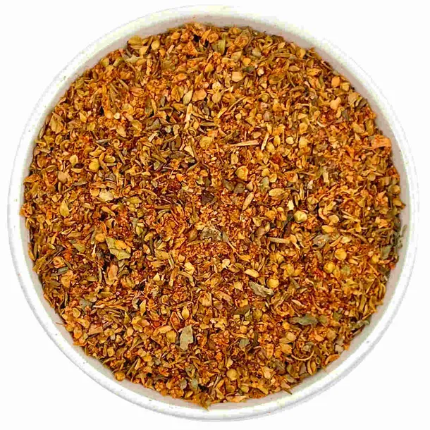 sól, oregano, cukier, kukurydza, papryka ostra, papryka słodka, tymianek, czosnek, bazylia, rozmaryn naturalny barwnik- ekstrakt papryki.