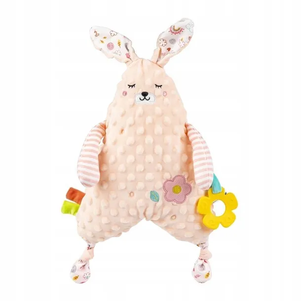 Słodki króliś, ozdobiony kwiatkami, to wymarzona przytulanka każdego małego pieszczocha! Ten śliczny zwierzak w pastelowych kolorach uszyty został z materiałów różniących się wzorem i fakturą, dzięki czemu, stymulować będzie zmysły bobasa, pomagając mu tym samym w rozwijaniu zdolności poznawczych. Zabawka wyposażona jest w gryzaczek z wypustkami, który przyniesie maluchowi ulgę podczas ząbkowania. Płaska i mięciutka forma zabawki zachęca do jej tulenia.