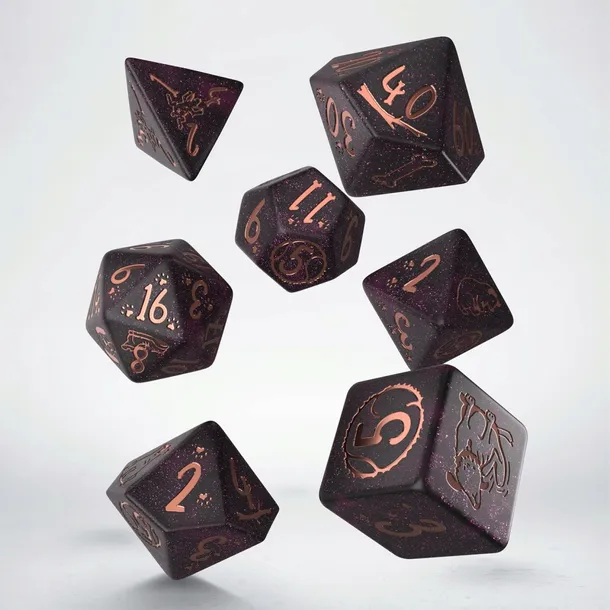 Psi Zestaw Kości: Luna to więcej niż zwykłe kostki. To hołd dla naszych futrzanych przyjaciół i ich radosnych wygibasów. Miedziane zdobienia na czarnym, upstrzonym fioletowym brokatem tle symbolizują związek między psami a ich nocnymi epizodami wycia do księżyca, które wszyscy dobrze znamy.