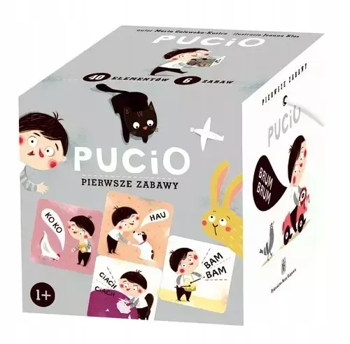 Uwielbiany przez dzieci i rodziców bohater bestsellerowej serii Marty Galewskiej-Kustry, fenomenalnie ilustrowanej przez Joannę Kłos, w końcu wykracza poza karty książek i pojawia się także w grach edukacyjnych! Zapraszamy do wspólnej zabawy i nauki! Pudełko zawiera 20 obrazków, 20 kartoników z podpisami oraz propozycje 6 zabaw z dziećmi rocznymi i starszymi. Zestaw składa się z dwóch rodzajów kartoników. Na jednych znajdują się obrazki z wyrażeniem dźwiękonaśladowczym, a także obiektem lub zwierzęciem wydającym dany dźwięk oraz wizerunkiem Pucia ? ulubionego bohatera maluchów. Na drugich są wyłącznie teksty ? te same onomatopeje, które występują na kartonikach z obrazkami. Wyrażenia dźwiękonaśladowcze są wypowiadane już przez roczne dzieci i stanowią bardzo istotny element rozwoju mowy. Zebrane w estetycznym pudełku obrazki dają okazję do rozmaitych zabaw, w zależności od możliwości intelektualnych i potrzeb dziecka: nauki nazywania obiektów, powtarzania i rozpoznawania wyrażeń dźwiękonaśladowczych, wyszukiwania wskazanych przez rodziców obiektów spośród kilku wybranych kartoników i wielu innych gier (opisanych w dołączonej do zestawu instrukcji). Zabawka może także stanowić pomoc w stawianiu pierwszych kroków w nauce czytania. Wyprodukowano w Polsce.