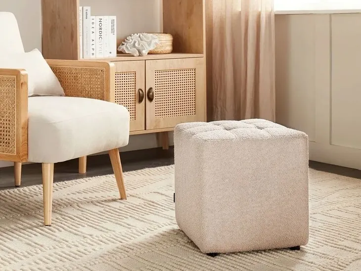 Dekoracyjny, kwadratowy puf znakomicie sprawdzi się jako dodatkowe miejsce do siedzenia, wygodny podnóżek lub podręczny stoliczek. Wykonany jest z wytrzymałego i łatwego w pielęgnacji obicia z materiału boucle w beżowym kolorze. Puf jest lekki i poręczny, dzięki czemu będzie praktycznym dodatkiem do salonu, sypialni lub pokoju dziecięcego.