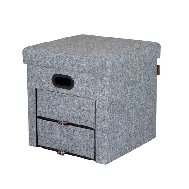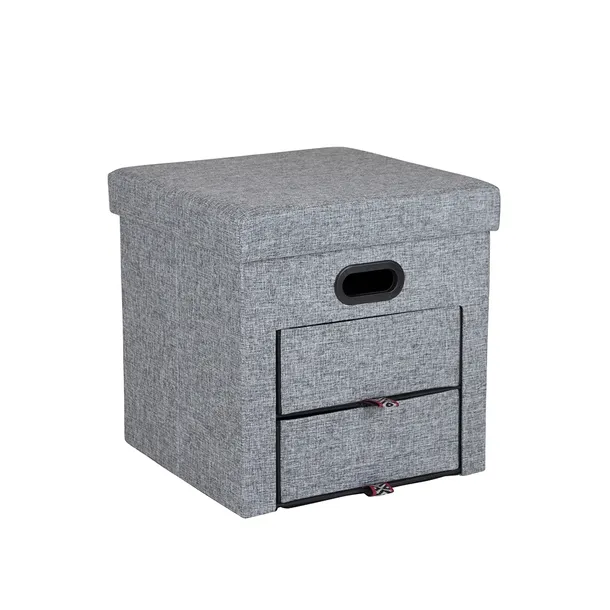 Wygodna, praktyczna i elegancka pufa w kształcie sześcianu z 2 szufladami. Wykonana z poliestru Oxford o wyglądzie lnu w szarym kolorze. Siedzisko wytrzymuje maksymalne obciążenie do 100kg. Wyposażona jest w 3 pojemne schowki (2 szuflady, oraz jeden otwierany od góry), uchwyt do wygodnego przenoszenia. Lekka i kompaktowa, po złożeniu zajmuje niewiele miejsca.