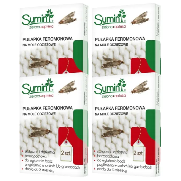 Pułapka feromonowa Sumin to skuteczne rozwiązanie w walce z molami odzieżowymi. Zestaw dwóch pułapek lepowych przeznaczony do monitorowania i eliminowania moli w miejscach przechowywania odzieży, takich jak szafy czy garderoby.
