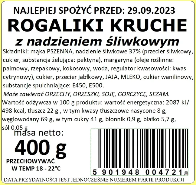 mąka PSZENNA, nadzienie śliwkowe 37% (przecier śliwkowy, cukier, substancja żelująca: pektyna), margaryna (oleje roślinne: palmowy, rzepakowy, kokosowy; woda, regulator kwasowości: kwas cytrynowy), cukier, przecier jabłkowy, JAJA, MLEKO, cukier wanilinowy, substancje spulchniające: E450, E500