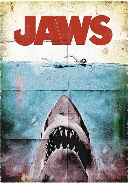 Puzzle Jaws przedstawiają kultowy plakat z filmu Szczęki. Po ich ułożeniu powstanie obraz o wymiarach 683x480 mm.