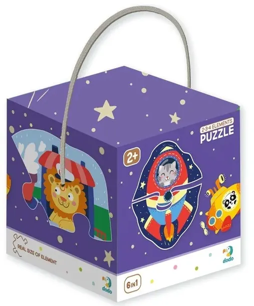 Puzzle DODO 2-3-4 elementy to wspaniałe zestawy puzzli dla najmłodszych, którzy dopiero rozpoczynają swoją przygodę z układankami. Duże puzzle i mała ilość elementów ułatwią zadanie. Puzzle 2-3-4 elementy to 6 kolorowych obrazków: 2 po 2 elementy, 2 po 3 elementy oraz 2 po 4 elementy.