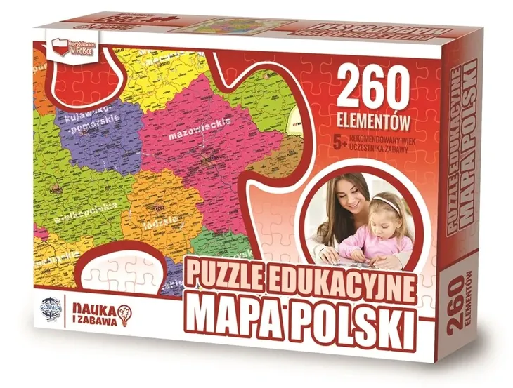Puzzle z mapą polityczną Polski. Zaznaczono na niej województwa, miasta oraz dokładną sieć hydrograficzną. Puzzle są doskonałą pomocą uzupełniającą wiedzę w zakresie geografii. Zostały wyprodukowane z bardzo dużą dbałością zarówno o poziom merytoryczny, jak i zgodnie z najwyższymi standardami technicznymi, przy użyciu wysokiej jakości materiałów.
