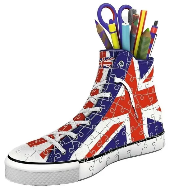 Now you can puzzle this very cool looking British Flag Sneaker 3D Puzzle, and when it is complete, you will have a very handy and practical pencil holder to display. Utilising the latest 3D puzzle technology you can create this stunning 3D Trainer which doubles as a lovely desk tidy or cute pencil pot. No glue required! Our Trainer 3D jigsaws are crafted with premium quality and when completed measure 21 X 8 X 13cm. Great 3D puzzles for Children 8 years old and up. This puzzle uses unique plastic pieces, which slot together to build a sturdy and strong model. No glue required! Either assemble by eye or using the numbers on the reverse side.