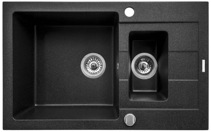 Ten produkt zrobiono z pyragranitu, który jest wytrzymały, odporny na zarysowania, a do tego wyróżnia się stylowym wyglądem. Producent wyposażył ten model w automatyczny korek, który umożliwia automatyczne otwieranie lub zamykanie odpływu w komorze. Mechanizm jest umieszczony pod zlewem, a na jego powierzchni umieszczone jest tylko pokrętło służące do obsługi korka. Dzięki takiemu rozwiązaniu jednym ruchem otworzysz odpływ bez potrzeby zanurzania ręki w zabrudzonej wodzie. Ten zlew wyposażono w ociekacz, który przyda się podczas codziennych prac kuchennych. Na ociekaczu możesz ułożyć mokre naczynia, użyć go jako przestrzeni do odmrażania żywności, a także odkładać na niego gorące garnki i patelnie. Ten model ma fabrycznie wycięte otwory, dzięki czemu bez problemu zamocujesz baterię kuchenną i pojemnik na płyn do mycia naczyń.