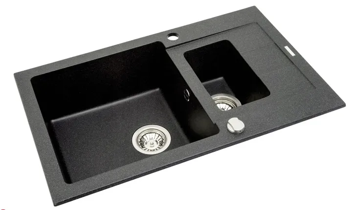 Zlewozmywak półtorakomorowy ma jedną dużą i małą komorę, tzw. pomocniczą. Dzięki dodatkowej komorze spokojnie umyjesz sztućce, obmyjesz żywność czy odcedzisz ryż, kiedy duża komora będzie załadowana brudnymi naczyniami. Jeżeli masz wielodzietną rodzinę, brakuje Ci zmywarki albo po prostu dużo gotujesz, najlepszym rozwiązaniem dla Ciebie będzie zlewozmywak dwukomorowy. Dysponując dwiema dużymi komorami z odpływami, będziesz mógł w jednej składować brudne naczynia, a w drugiej swobodnie obmywać żywność lub myć ręce. Co ważne, dwie komory umożliwią Ci jednoczesne mycie i płukanie naczyń. Wpuszczenie w blat to najpopularniejszy sposób montażu zlewu kuchennego. Wystarczy, że wytniesz otwór w blacie o właściwej wielkości i zamocujesz w nim zlewozmywak za pomocą specjalnych zaczepów. Zlew wykonano z granitu, który wyróżnia się niezwykłą trwałością. Dzięki temu zlewozmywak jest odporny na gwałtowną zmianę temperatury, uszkodzenia mechaniczne i zabrudzenia powstające w czasie codziennego użytkowania.