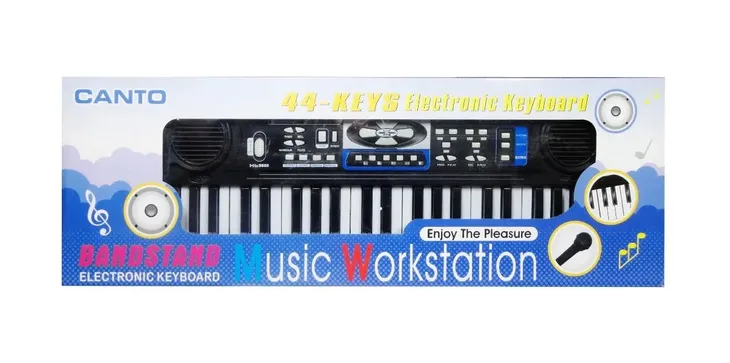 Muzyczny zestaw dla małego fana elektronicznej muzyki. Organki posiadają 44 klawisze z całą gamą dźwięków, wgranych gotowych melodii, rytmów i tonów. W czasie tworzenia muzyki dziecko otrzymuje możliwość regulacji tempa, tonów, itp. Do zabawki dołączono także mikrofon. Zabawka zawiera zasilacz. Produkt zapakowany w kartonowe opakowanie z przezroczystym okienkiem. Podane wymiary są wymiarami opakowania. Zabawka dla dzieci od 3 lat.