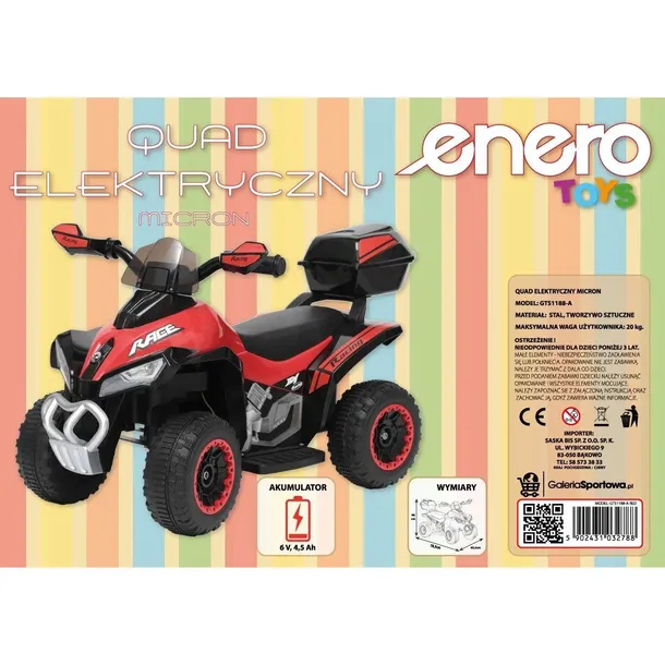 Quad Micron Enero to bezpieczny, elektryczny pojazd czterokołowy skonstruowany tak, aby jego obsługa była prosta oraz bezpieczna elektryczny silnik sprawia, że jest niezwykle ekologiczny i bez spalinowy ruchoma kierownica z gumowymi uchwytami pozwala dziecku na skręt w lewo lub w prawo posiada przycisk aktywujący 3 różne wesołe melodie oraz migające kolorowe światła w lampach montowany na śruby kuferek pozwala ukryć najpotrzebniejsze skarby dziecka doskonały pomysł na prezent dla każdego malucha.