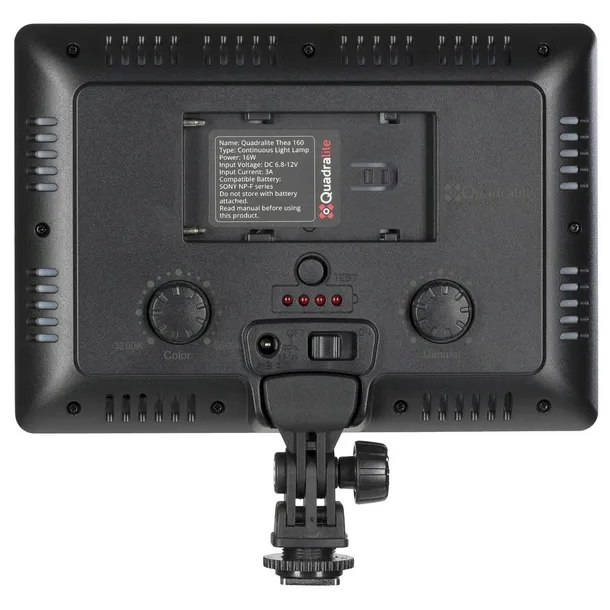 Panel LED Quadralite Thea 160 pozwala wygodnie pracować praktycznie w każdych warunkach. W zależności od potrzeb może być zasilany przez popularny wśród filmowców akumulator litowo jonowy Sony NP-F970 (lub inne z serii NP-F), a także przez opcjonalny zasilacz sieciowy Quadralite 9V 2.5A. Z tyłu lampy znajdziemy także włącznik zasilania oraz czterosegmentowy wskaźnik informujący o poziomie dostępnej energii.