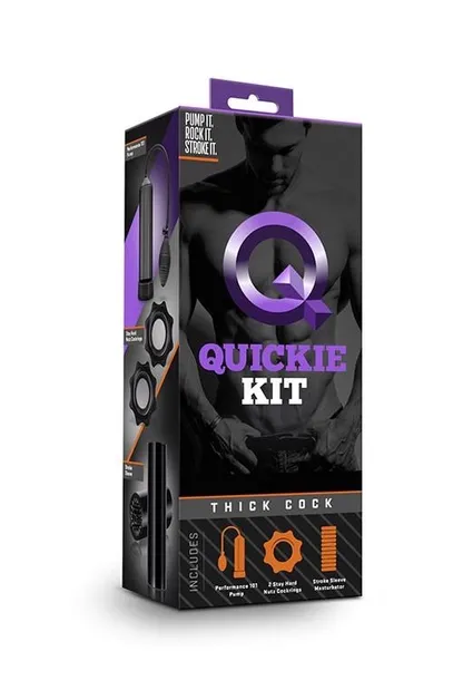 The Quickie Kit - Thick Cock delivers three different ways to stimulate your penis. Explore new sensations with the strong suction of the squeeze ball pump, whose 8-inch chamber, flexible silicone tube, and quick release valve ensure maximum comfort. Or caress and stimulate your shaft with the soft, flexible stroke sleeve. It features teasing ticklers and slightly ribbed walls to engulf your penis, plus it's open ended for easy clean-up. This Quickie Kit also includes two stretchy cock rings! All products are made of body safe materials for your comfort and safety.Quality squeeze ball pump. Soft stroke sleeve with two stimulating textures. Two cock rings to explore. Body safe material. No fragrances, phthalates paraffins or latex. Dimensions:Pump: 9.5 inch length (8 inch insertable) x 2.25 inch width = 24,13 cm (20,3 cm) x 5,7 cmSleeve: 5.5 inch length x 1.5 inch width = 13,9 cm x 3,8 cmCock Rings: 0.78 inch inner diameter / 1.7 inch outer diameter = 2 cm / 4,3 cm