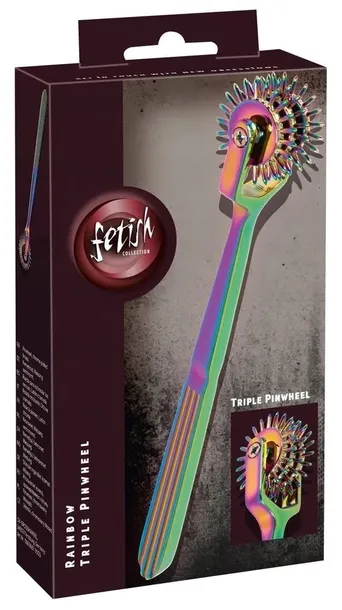 Wytrzymały metalowy wiatraczek Rainbow Triple Pinwheel z kolekcji fetyszowej w mieniących się kolorach tęczy. Jest on przesuwany po skórze z większym lub mniejszym naciskiem, powodując delikatne stymulujące doznania lub intensywny przyjemny ból. Trzy koła z małymi, bardzo ostrymi igłami mogą być używane w dowolnym miejscu na ciele. Długi, wąski uchwyt wygodnie leży w dłoni i zapewnia optymalne prowadzenie oraz zmienny, łatwy do zastosowania nacisk.