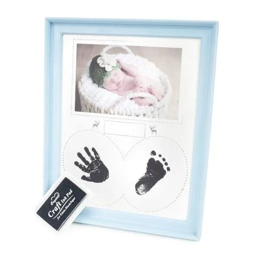 plastikowa ramka na zdjęcia, rozmiar ramki 22,2 x 27,4 cm, szerokość listwy 2 cm, do postawienia lub powieszenia, zawiera tusz do wykonania odcisku dłoni lub stopy dziecka