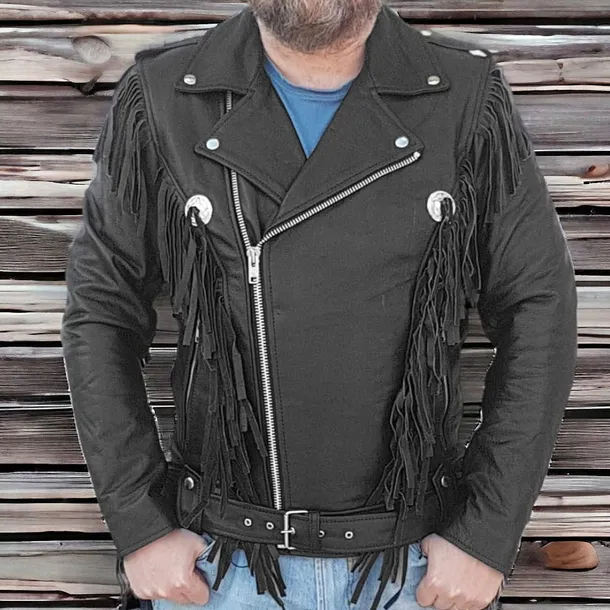 Kurtka Ramoneska Męska z Frędzlami - Ikona Stylu i Najwyższej Jakości Skóry Anilinowej