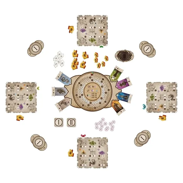 Zawartość: 5 plansz graczy ? 1 plansza główna ? 2 boczne kafelki z gniazdami ? 5 kafelków satelitów ? 1 kafelek czarnej dziury ? 45 znaczników zarodników ? 80 kart biomów I i II ery (65x65mm) ? 7 kafelków boskich istot ? 5 znaczników energii ? 5 totemów ? 52 żetony kryształów ? 6 żetonów punktacji +100