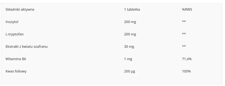 Inozytol, L-tryptofan, Ekstrakt z kwiatu szafranu, Witamina B6, Kwas foliowy, substancje wypełniające: celuloza mikrokrystaliczna; skrobia; substancje przeciwzbrylające: stearynian magnezu, dwutlenek krzemu, węglan wapnia.