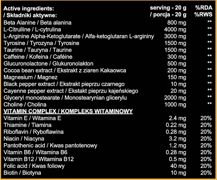 Odżywka przedtreningowa Behemoth wyróżnia się sprawdzonym i starannie dobranym składem. Można w niej znaleźć takie składniki, jak:
