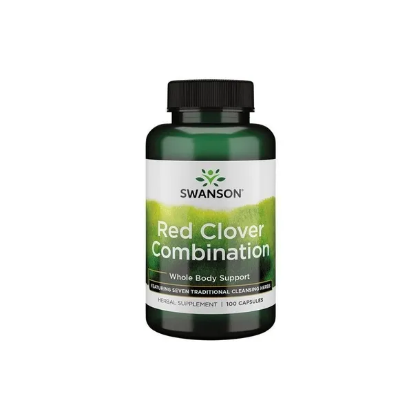 Swanson Red Clover Combination zawiera dziewięć ziół oczyszczających, w tym kwiat koniczyny czerwonej, korzeń mniszka lekarskiego, liść echinacei, korzeń lukrecji, kora brzoskwini, liście babki lancetowatej, sarsaparilla korzeń i żółty korzeń doku.