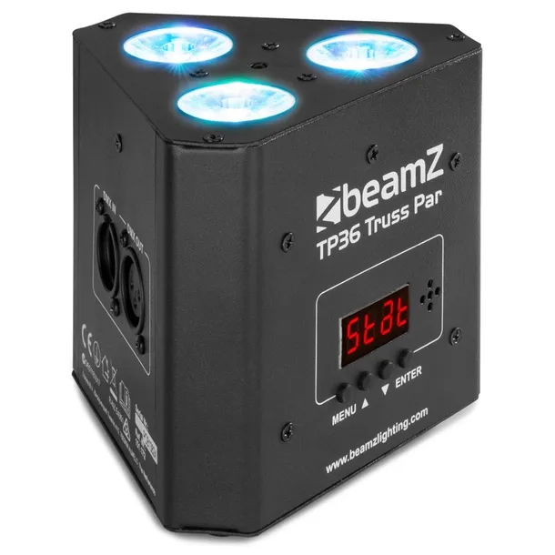 TP36 to kompaktowy reflektor od marki BeamZ. Wyposażony został w 3x 4-w-1 super jasne diody LED 4W z możliwością mieszania kolorów RGB + UV. Jest on idealną propozycja do podświetlenia trójkątnych kratownic, do których często trudno jest dobrać oświetlenie tak, aby rozmiarem zmieściło się pomiędzy trójnóg i nie wychodziło po za podświetlaną lycrę. Reflektor powinien znaleźć miejsce w wyposażeniu DJ-ów, zespołów i firm producenckich. W zestawie znajduje się pilot zdalnego sterowania.