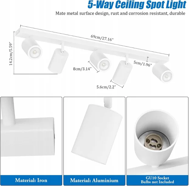 - Gniazdo GU10: reflektor sufitowy jest wyposażony w 5 gniazd GU10 i umożliwia łatwą wymianę żarówek (maks. 50 W). Żarówki nie wchodzą w zakres dostawy. Wybierz swój własny kolor światła i spraw, aby Twój dom błyszczał pięknym światłem.