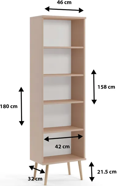 Regał postawiony na długich, drewnianych nóżkach. Jego skandynawski styl sprawia, że szafa doskonale sprawdzi się zarówno w sypialnijak i w salonie. Posiada cztery półki z regulowaną wysokością które idealnie zagospodarują przestrzeń.