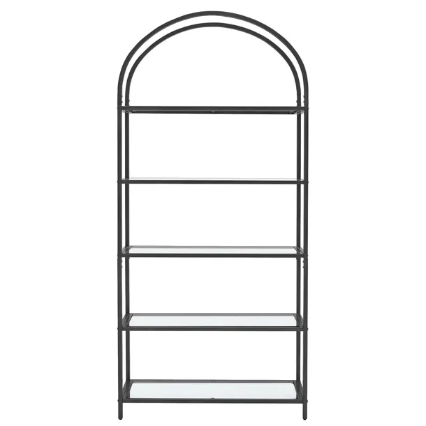 Regał wykonany ze szkła i stali malowanej proszkowo na kolor czarny. Produkt tworzy niesamowitą dekorację Twojego pomieszczenia, dzięki łukowemu designowi. Półki regału są stabilne, a więc możemy umieścić na nich książki, kwiaty w wazonach, ozdobne figurki, dziecięce zabawki oraz ramki ze zdjęciami. Nowoczesny, luksusowy a zarazem ciekawy wygląd regału, te cechy na pewno skłonią Cię do wyboru tego mebla. Regał cechuje się uniwersalnością oraz funkcjonalnością, będzie świetnie pasował do salonu, sypialni, łazienki, domowego gabinetu, kuchni, a 5 półek ułatwi nam dostęp do ulubionych rzeczy. Regał na pewno wpasuje się w wystrój niejednego pomieszczenia. Stalowa konstrukcja zapewnia stabilność mebla. Idealnie spasowane elementy ramy oraz szklane półki nadadzą Twojemu wnętrzu wdzięku. Zadbaj o estetykę swojego salonu, pokoju, kuchni czy sypialni wybierając produkty sprawdzone, o najwyższej jakości wykonania.