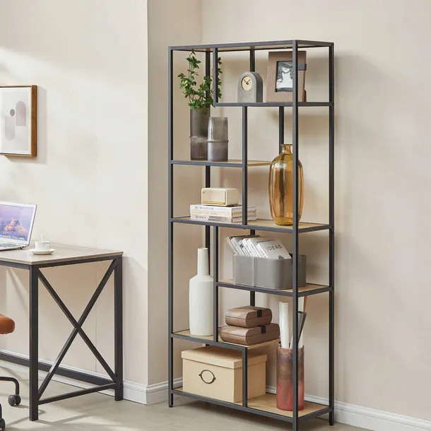 Regał cechuje się uniwersalnością oraz funkcjonalnością, będzie świetnie pasował do salonu, sypialni, przedpokoju, gabinetu, a 6 półek ułatwi nam dostęp do ulubionych rzeczy.