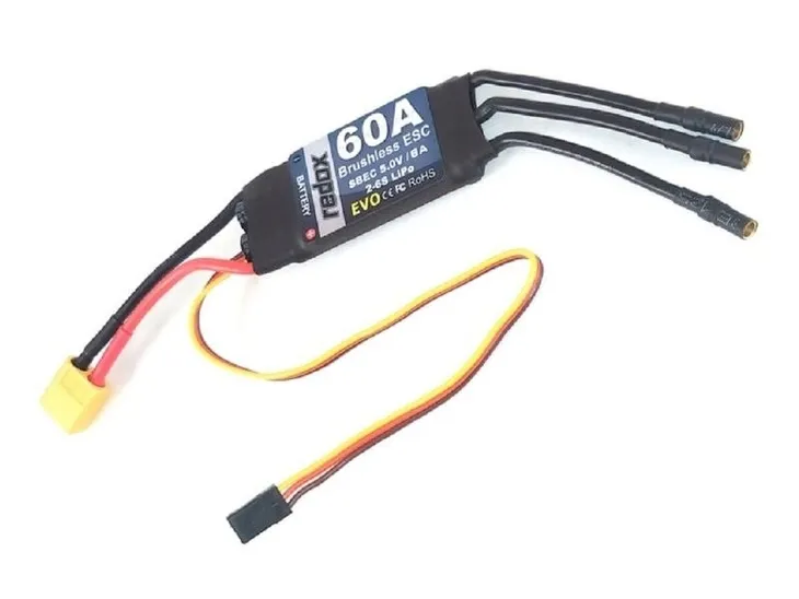 Uniwersalny regulator Redox EVO 60A do silników bezszczotkowych przeznaczony do użytku w modelach samolotów i helikopterów.