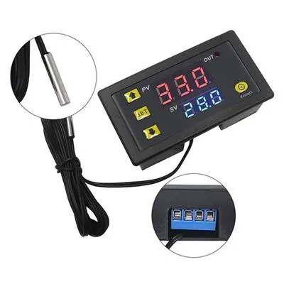 Cyfrowy termostat, regulator temperatury. Wyposażony w wodoodporną sondę na długim przewodzie, która umożliwia pracę w wilgotnym środowisku (akwaria i terraria). Świetnie sprawdzi się również przy regulacji temperatury pracy rozmaitych urządzeń. Łatwy montaż oraz prostota obsługi (fizyczne przyciski). Dwa cyfrowe wyświetlacze umożliwiają podgląd aktualnej oraz zadanej temperatury. Umożliwia automatyczną regulację temperatury oraz jej pomiar w zakresie -50 stopni do 120 stopni Celsjusza. Dodatkowo wyposażony w funkcję histerezy, temperatur granicznych, opóźnienia załączenia przekaźnika oraz alarmu temperatury.