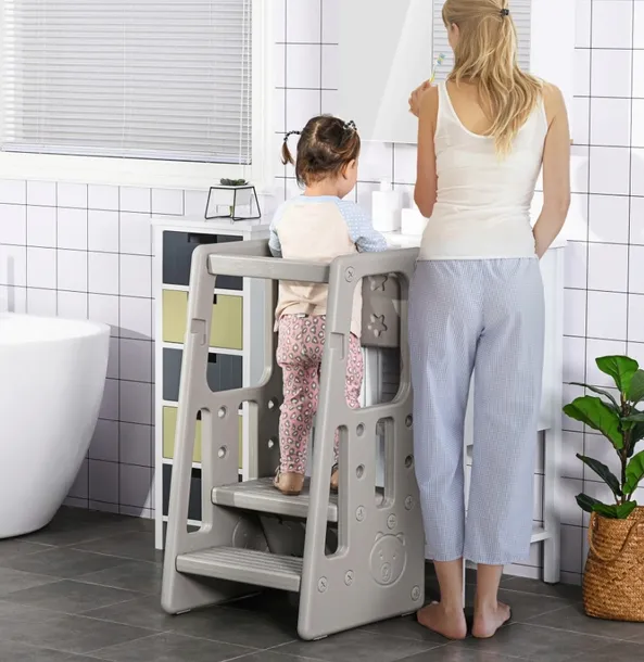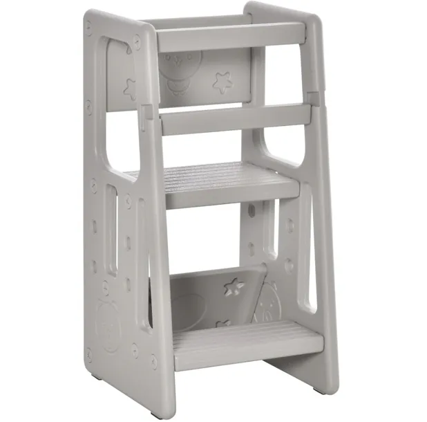 Antypoślizgowe stopy i uchwyty: Antypoślizgowe stopy zapewniają bezpieczne, stabilne ustawienie, podczas gdy praktyczne uchwyty pomagają Twoim małym odkrywcom wygodnie się trzymać, gdy pomagają Ci w kuchni.