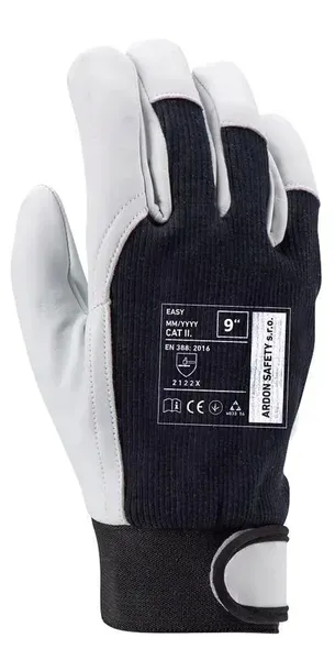Ardon Easy to rękawice robocze przeznaczone do precyzyjnych prac gdzie wymagana jest dobra chwytność. Rękawice wykonane z materialw mieszanych. Część chwytna zrobiona jest z jednego kawałka koziej skóry (całodłonicowa), a kciuk i palec wskazujący są również skórzane. Prążkowana dzianina jest elastyczna i przyjazna skórze, doskonale chłonie pot i jest przewiewna. W nadgarstku zastosowano mankiet wykończony taśmą z rzepem co ułatwia optymalne dopasowanie i zapobiega zsuwaniu się rękawic z ręki podczas pracy. Czarno-biała kolorystyka prezentuje się efektownie i profesjonalnie. Produkt zgodny z normą: EN-420:2003+A1:2009 - wymagania ogólne, oraz EN-388:2016 (2122x) - ochrona mechaniczna. Kategoria ochronna 2.
