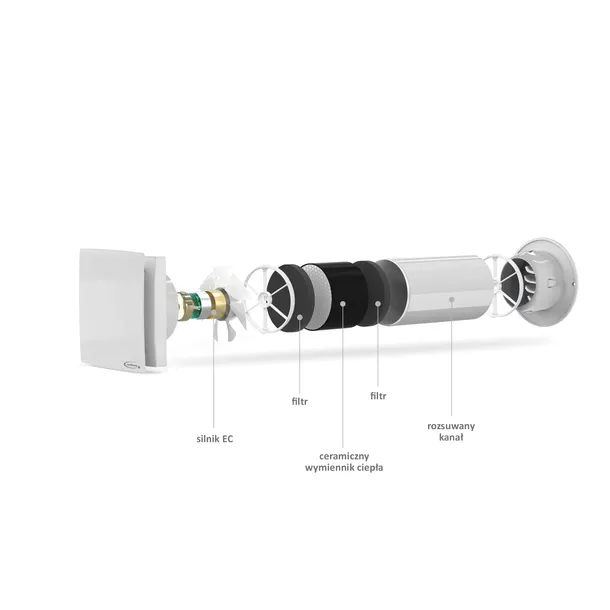 Wentylator aRheat jest wyposażony w ceramiczny wymiennik ciepła, który umożliwia dostarczanie świeżego powietrza i powietrza wyciągowego z odzyskiem energii cieplnej.