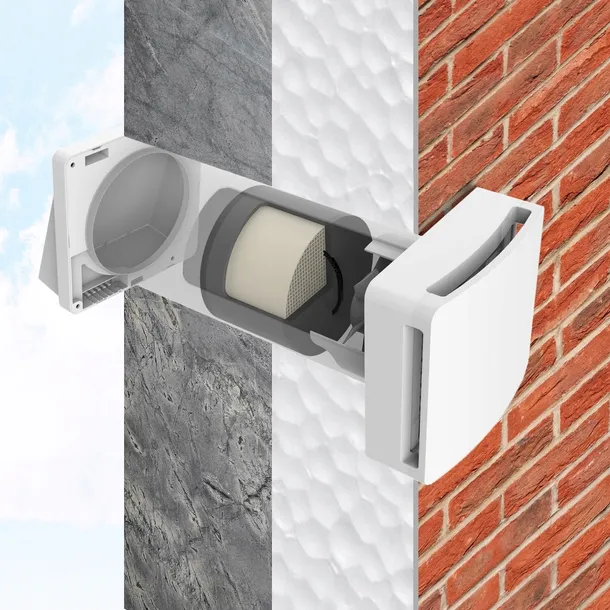 Urządzenie EBERG REQU2 + działa na zasadzie zmiennej wentylacji. Najpierw usuwa zużyte powietrze, jednocześnie ogrzewając ceramiczny wymiennik ciepła. Następnie nawiewa świeże, filtrowane powietrze, które jest podgrzewane przez ten sam wymiennik. Kierunek przepływu powietrza zmienia się co 70 sekund, co zapewnia efektywną wymianę powietrza.
