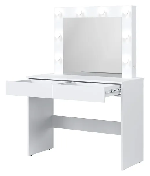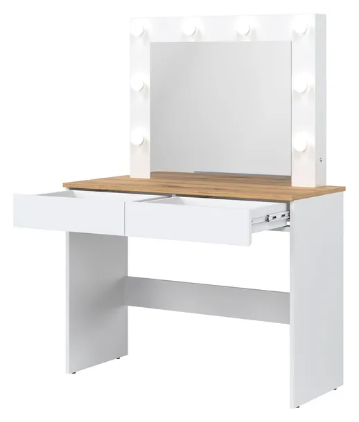 Toaletka REMI RM16 świetnie sprawdzi się w sypialni, pokoju młodzieżowym. Obszerne lustro pozwoli zrobić idealny makijaż czy fryzurę, a dwie pojemne szuflady pomieszczą wszystko czego potrzebujesz do codziennej pielęgnacji. Jej największym atutem jest oświetlenie LED w formie 8 lampek, umieszczonych wokół jej tafli. Nowoczesna kolorystyka pozwoli stworzyć idealne wnętrze, dostosowane do gustu i wymagań jego użytkowników. Kolekcja charakteryzuje się minimalistycznym wyglądem oraz funkcjonalnością. Toaletka idealnie sprawdzi się w konfiguracji z innymi bryłami z serii REMI lub jako pojedynczy mebel, który można dopasować do własnej aranżacji pomieszczenia.