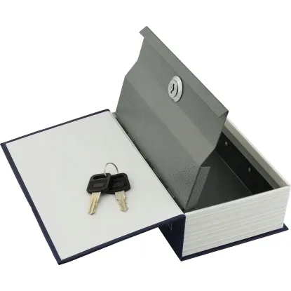 Przenośna metalowa kasetka na pieniądze lub inne kosztowności ukryta w książce.