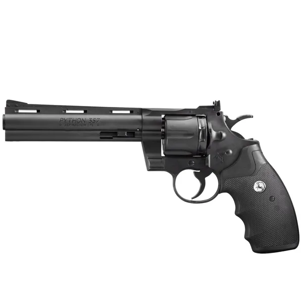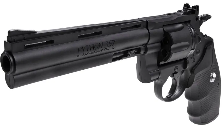 Wiatrówka - rewolwer Colt Python .357 6'' to wierna replika rewolweru Magnum .357, napędzana 12 g nabojem z gazem CO2. Na rewolwer naniesiono licencjonowane oznaczenia firmy Colt.