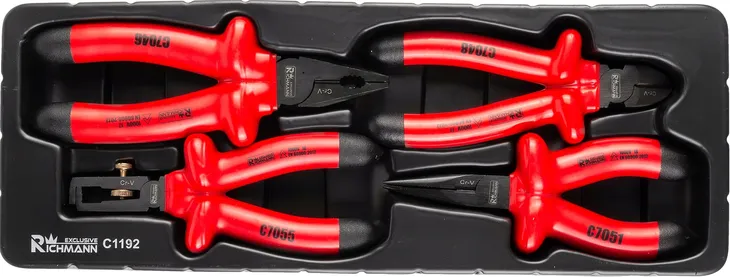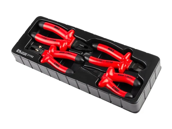 Zestaw 4 sztuk izolowanych szczypiec umieszczonych we wkładzie do wózka warsztatowego.