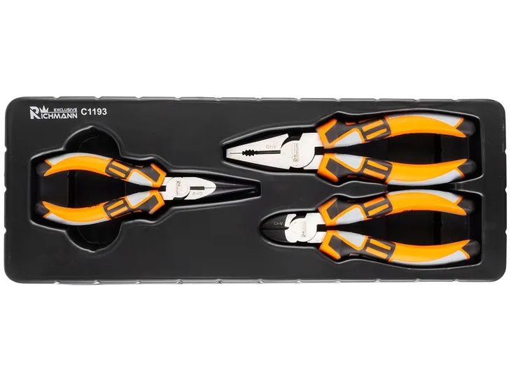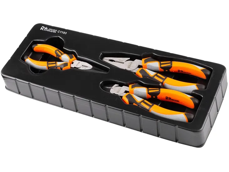 Zestaw 3 sztuk szczypiec umieszczonych we wkładzie do wózka warsztatowego.