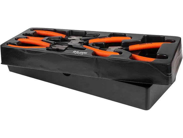 - Zestaw 4 sztuki szczypiec przeznaczonych do zakładania/zdejmowania pierścieni Seegera umieszczonych we wkładzie do wózka warsztatowego typu A.