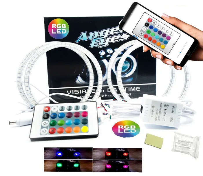 4x Ringi lub Pierścienie tzw. Oczy Anioła lub Angel Eyes W TECHNOLOGII RGB RGBW z funkcją zmiany 16 kolorów za pomocą pilota lub telefonu który posiada aktywną podczerwień IR.