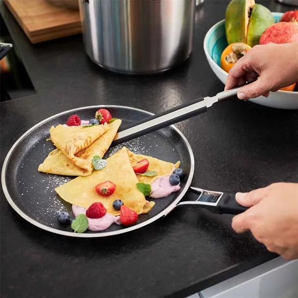 Idealny do obracania naleśników, ale także do wygładzania ciasta, kremów, glazury lub do obracania mięsa, ryb lub jajek sadzonych. Dzięki ukośnemu czubkowi bez problemu wejdziesz pod krawędź ciasta i łatwo przekręcisz naleśnik. Idealny do naczyń z powłokami nieprzywierającymi. Zapobiega rysom i uszkodzeniom powierzchni. Trwała mieszanka stalowo-silikonowa.
