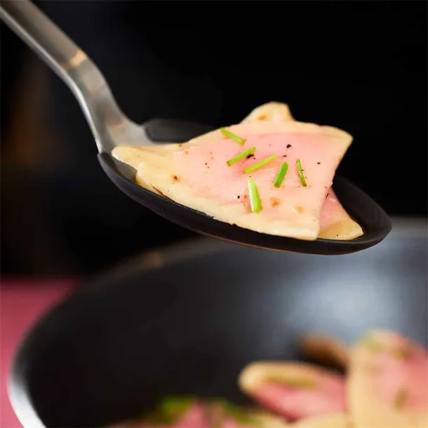 Łyżka do nalewania i porcjowania potraw na patelniach i w garnkach. Idealna do pracy na patelniach z powłoką zapobiegającą przywieraniu. Odporny na temperaturę do 220 stopni C. Można myć w zmywarce. Trwała mieszanka stalowo-silikonowa.