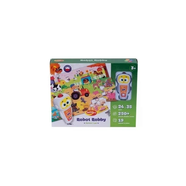 Robot Robby zaprasza na zabawę w układanie i odkrywanie! Pierwszy etap zabawy polega na ułożeniu dwóch obrazków ze znajdujących się w zestawie puzzli. Gdy już maluch upora się z tym zadaniem, do gry „wkroczy" wesoły robocik, który przygotował dla najmłodszych ponad 350 dźwięków i aż 16 różnych gier, a wśród nich szukanie zwierzątek na obrazku, dopasowywanie ich odgłosów, odtwarzanie sekwencji i rozpoznawanie domków zwierzaków. Dźwięki pochowane są w 32. aktywnych polach, oznaczonych kodem kreskowym. Aby robot prawidłowo odczytał pole, należy delikatnie przycisnąć końcówkę robota do kodu kreskowego, umieszczając robota pionowo nad polem.