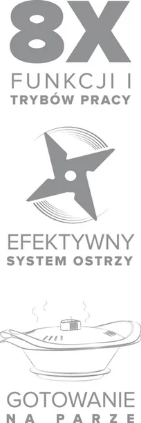 - gotowanie, gotowanie na parze, panel sterowania z wyświetlaczem, regulacja temperatury, smażenie, tryby pracy: rozdrabnianie, ubijanie, wyłącznik czasowy, wyrabianie ciasta, zakres obrotów: 100-4500 obr./min