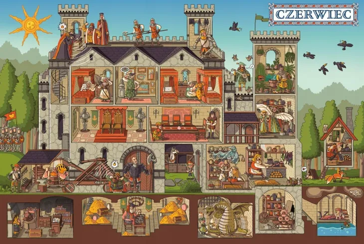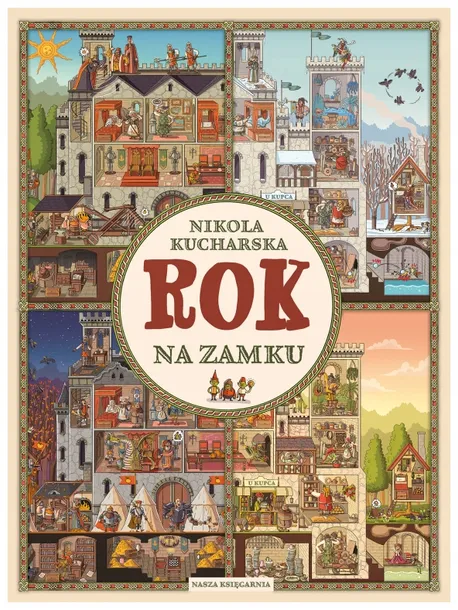 Witajcie na zamku króla Bolebora i królowej Drogomiry! Spędzicie na nim cały rok. Będzie się dużo działo. Poznacie wielu jego mieszkańców: królewskie córki, szukającego miłości barda, samotnego ducha, mnicha Bławatka, płatającego figle błazna Dzwonka, wiecznie kłócących się królewskich doradców i wielu, wielu innych. Dowiecie się, jak przez przypadek można doprowadzić do wojny, kto burzy spokój królewskiego skarbnika, czy królewnie Samboi uda się zostać rycerką oraz do czego mogą się przydać wynalazki królowej i rośliny hodowane przez ogrodnika Wacława. Zapraszamy na zamek, gdzie przeżyjecie fantastyczne przygody!„Rok na zamku” można oglądać godzinami. Ta niezwykła książka pobudza wyobraźnię, rozwija spostrzegawczość, umiejętność opowiadania, a przede wszystkim gwarantuje świetną zabawę.Nikola Kucharska – ilustratorka i autorka książek, komiksów i gier planszowych dla dzieci i młodzieży. Ukończyła projektowanie graficzne na katowickiej ASP. Ma na koncie kilkadziesiąt książek. Współpracuje z wieloma wydawcami w Polsce, Francji, Chinach, Rosji, Korei, Niemczech czy Hiszpanii. Jej „Podróż dookoła świata. Północ–południe. Wschód–zachód” nominowano w konkursie PTWK Najpiękniejsza Książka Roku 2016, a „Zwierzęta, które zniknęły. Atlas zwierząt wymarłych” (teksty: Katarzyna Gładysz, Joanna Wajs i Paweł Łaczek) otrzymały nagrodę główną w konkursie Mądra Książka Roku 2018, wyróżnienie w XVII edycji konkursu Świat Przyjazny Dziecku oraz nominację w konkursie Przecinek i Kropka Najlepsza Książka Roku 2018.