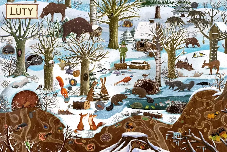 Dziki, wilki, bażanty, niedźwiadek, mrówki, dzięcioł, lisy, borsuk, zaskrońce, żaby, łoś i wiele innych zwierzaków zamieszkuje pewien las. Jak się bawią, a jak odpoczywają? Kto śpi w dzień, a kto w nocy? Kto się z kim lubi? Kto jakie ma przysmaki? Poszukajcie odpowiedzi na kartach tej niezwykłej książki. Rok w lesie zawiera dwanaście rozkładówek z kolejnymi miesiącami jednego roku. Każdy miesiąc to ten sam szczegółowo rozrysowany kadr lasu z mieszkańcami pokazanymi w innych sytuacjach, warunkach pogodowych, w innej porze dnia lub nocy. Dwie dodatkowe rozkładówki zawierają prezentację bohaterów i interaktywną zabawę. „Rok w lesie”można oglądać godzinami. Ta niezwykła książka pobudza wyobraźnię, rozwija spostrzegawczość, zdolność logicznego myślenia, szukania związków przyczynowo-skutkowych, umiejętność opowiadania, a przede wszystkim gwarantuje świetną zabawę. Emilia Dziubak – autorka i ilustratorka książek dla dzieci. Absolwentka Akademii Sztuk Pięknych w Poznaniu. Współpracuje z autorami i wydawnictwami w Polsce i za granicą. Laureatka Nagrody Literackiej m.st. Warszawy w 2014 r. Laureatka nagrody „Przecinek i Kropka” w konkursie na najlepszą książkę dziecięcą w 2016 r. Wyróżniona w 2016 r. w konkursie PTWK Najpiękniejsze Książki Roku 2015 za autorską książkę Rok w lesie. Laureatka nagrody „Żółta Ciżemka” w 2017 r. W 2018 r. wyróżniona w konkursie Książka Roku Polskiej Sekcji IBBY. Laureatka nagrody Soligatto 2019.