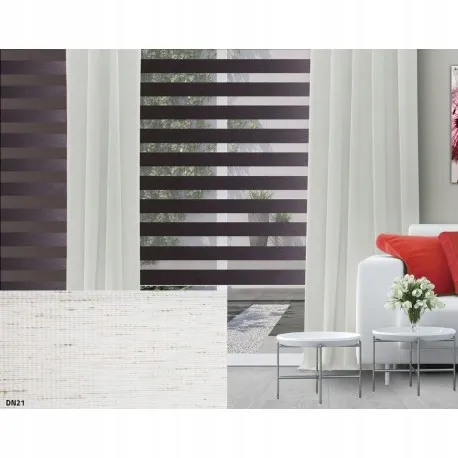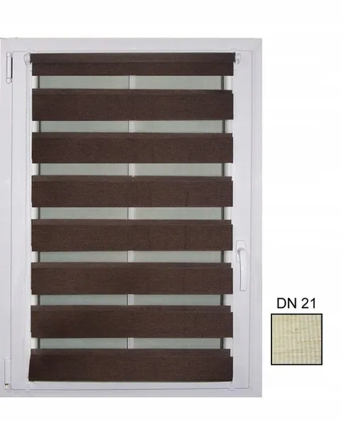 ROLETA MINI 110X150 DN21 W skład rolety "DZIEŃ-NOC" wchodzi : Rurka z nawiniętym materiałem Regulowane górne uchwyty mocujące z przylepcami Łożysko mechanizmu sterującego Mechanizm łańcuszkowy – pętla Listwa górna tylna materiału Napinacz łańcuszka Rurka obciążająca Zaślepki rurki obciążającej wraz z przelotkami żyłki Żyłka i napinacz dolny żyłki *dodatkową opcją jest fix (zaczep przylepny)